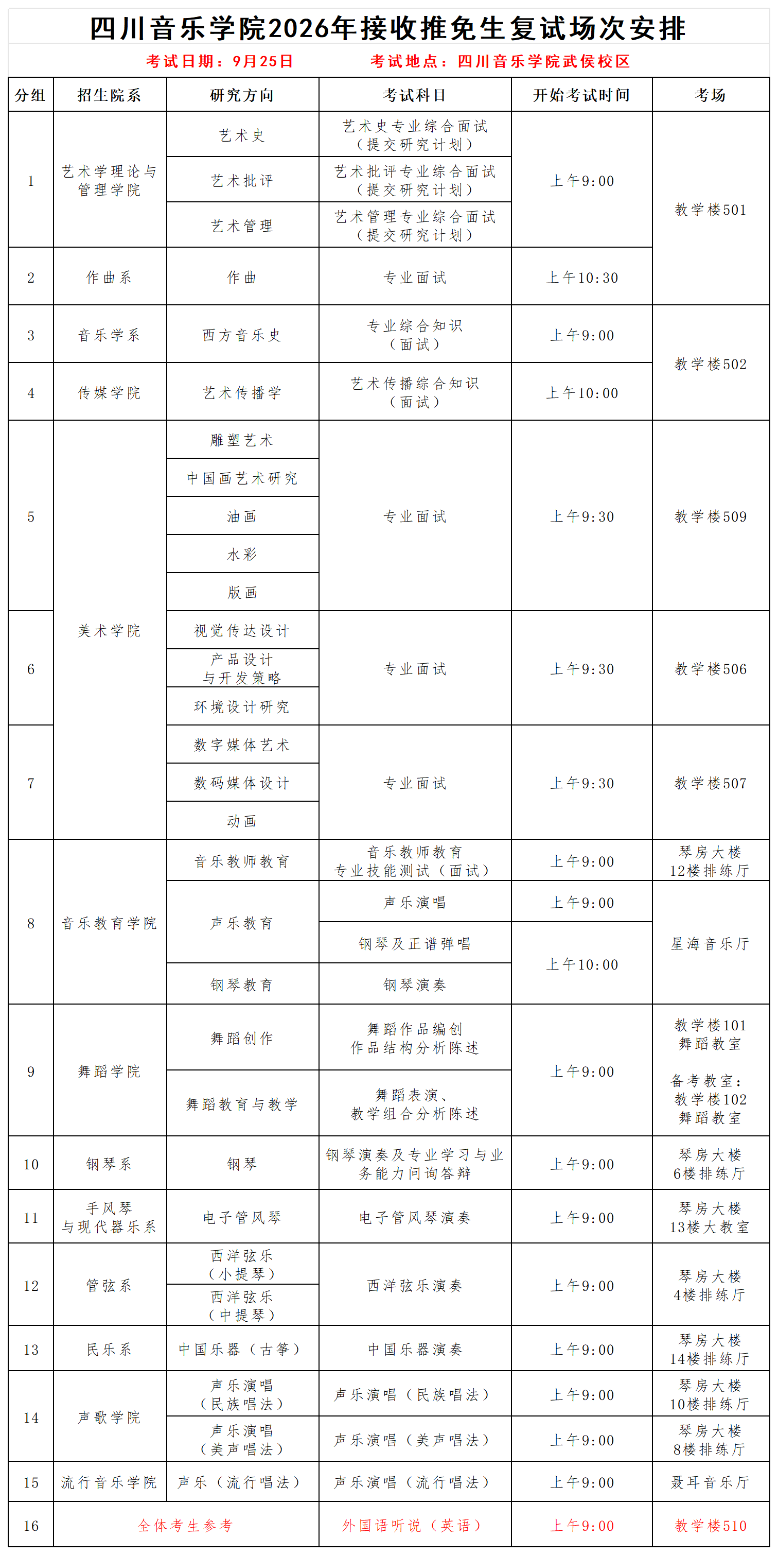 根据教育部、上级招考委相关文件精神,结合四川音乐学院2026年接收推荐免试攻读硕士学位研究生工作办法,我校2026年接收推免生复试安排如下。