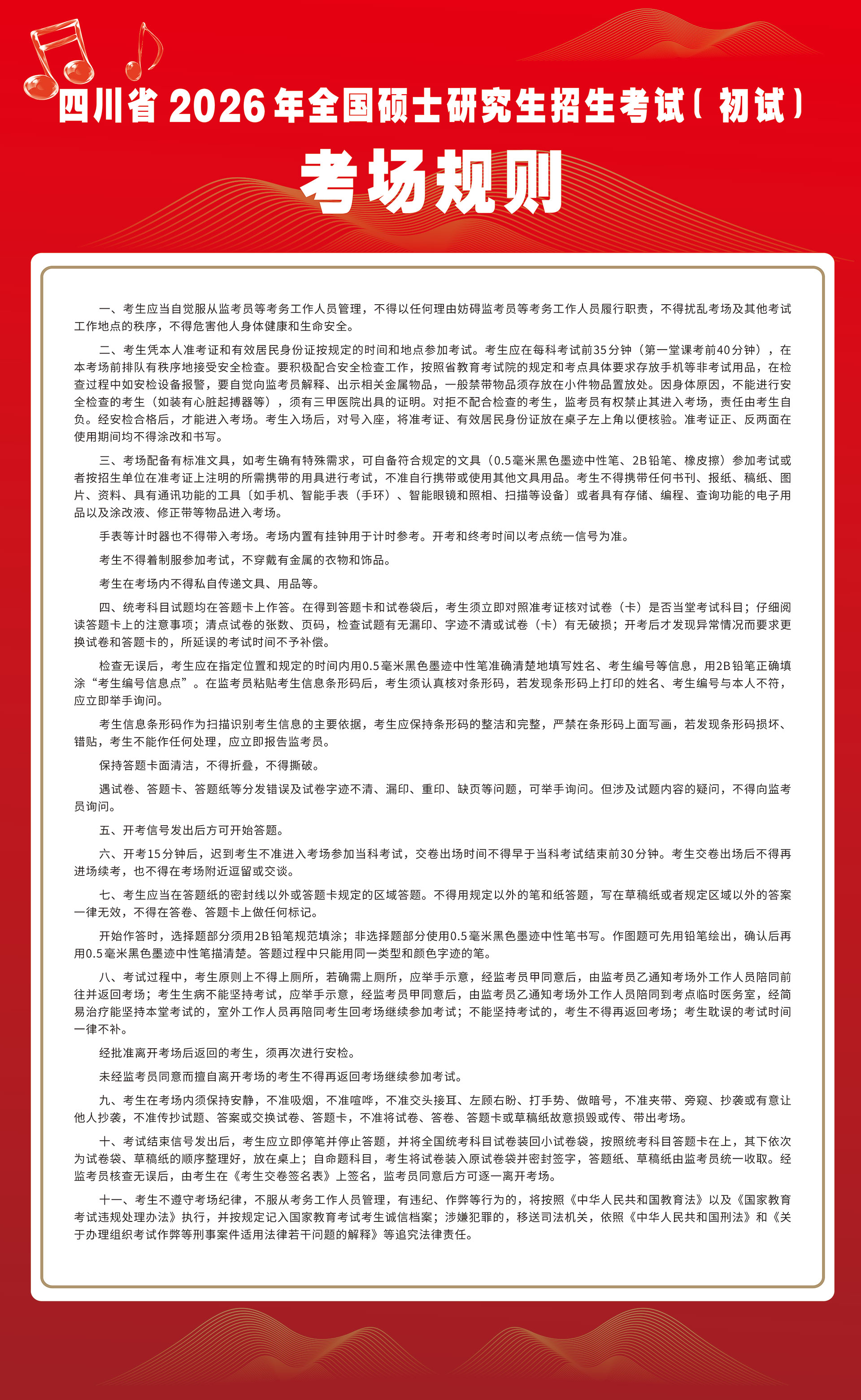 2026年全国硕士研究生招生考试(初试)将于12月20日-21日进行,为确保考生顺利参加考试,请认真阅读《考场规则》相关要求,并知悉我校考点有关情况,通知如下。