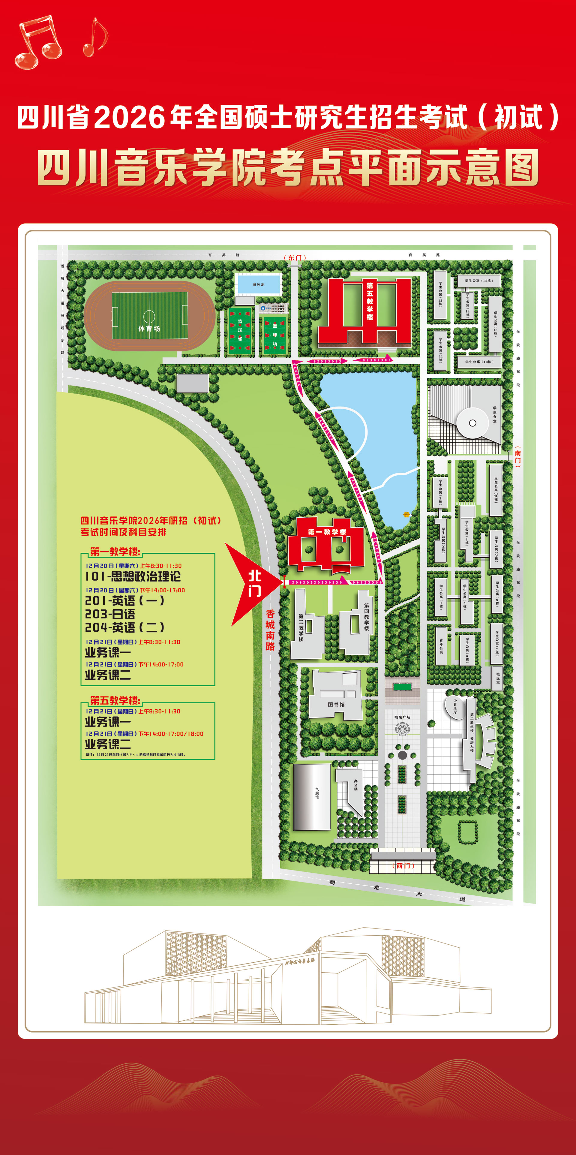 考点地址:四川音乐学院新都校区(成都市新都区蜀龙大道中段620号),具体考场见准考证。点击查看:新都校区平面图)